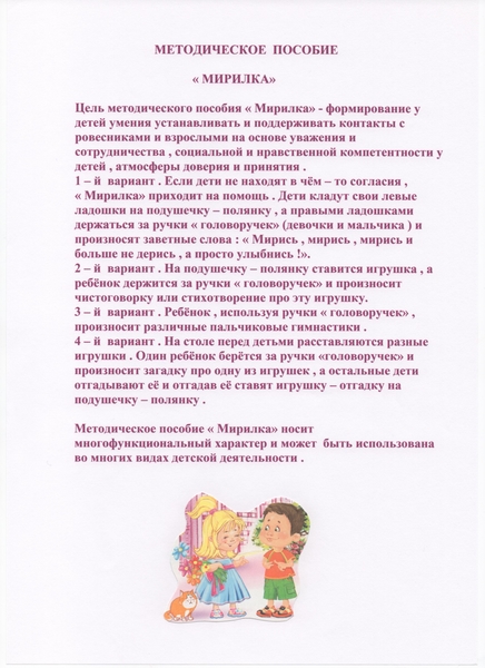 Цель методического пособия "Мирилка"- формирование у детей умения устанавливать и поддерживать контакты с ровесниками и взрослыми на основе уважения и сотрудничества...