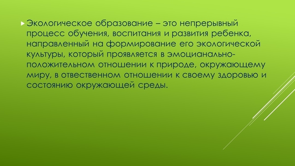 Экологическое образование – это непрерывный процесс обучения, воспитания и развития ребенка, направленный на формирование его экологической культуры, который проявляется в эмоцианально-положительном отношении к природе, окружающему миру, в отвественном отношении к своему здоровью и состоянию окружающей среды.