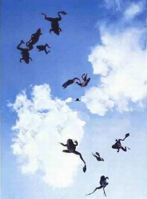 Еще один случай, произошедший в Англии. 12 июля 1954 г. в бирмингемском парке происходила ярмарка. Покупателей, как обычно, было очень много. И вот на глазах тысяч свидетелей во время маленького дождика из поднебесья стали падать лягушки, которые имели длину в три четверти дюйма. Кожа этих амфибий была окрашена в цвет хаки. Лягушки прыгали повсюду: по дорогам, по зонтикам, по людям.