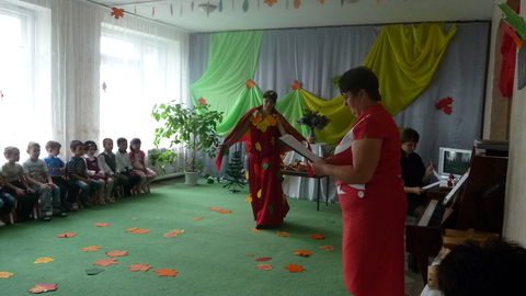 Осень: Вот мы и в лесу, посмотрите, какая красота. Красные, желтые листочки на деревьях я развесила как украшения. (показывает на атрибут леса)